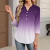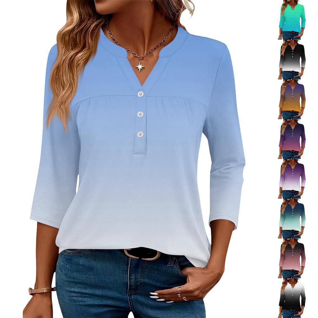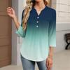 Women's Fashionable Casual Color Block Gradient Print V-Neck Button Three-Quarter Sleeve T-Shirt Top