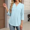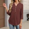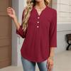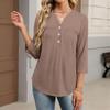 Women's Fashionable Casual Color V-Neck Decorative Button Three-Quarter Sleeve T-Shirt Top