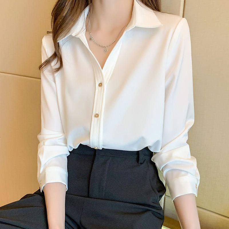 Elevate your professional wardrobe with this elegant women's shirt, perfect for spring and autumn wear. Crafted from soft satin, this shirt offers a smooth and luxurious feel. It features a stylish turn-down collar that adds a classic touch to your outfit. While the shirt is designed with long sleeves, the sleeve length detail adds a unique and contemporary flair. Ideal for both office settings and sophisticated casual occasions, this shirt effortlessly combines comfort and style.