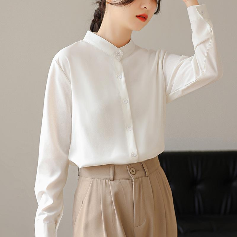 Elevate your wardrobe with this elegant women's shirt, designed for the stylish seasons of spring and autumn. Crafted from a soft cotton blend, this chiffon shirt promises both comfort and a sophisticated touch. The solid pattern and loose fit ensure a relaxed yet polished look, while the long sleeves and stand collar add a hint of French flair. Perfect for both professional and casual settings, this versatile piece is a must-have for any fashion-forward wardrobe.