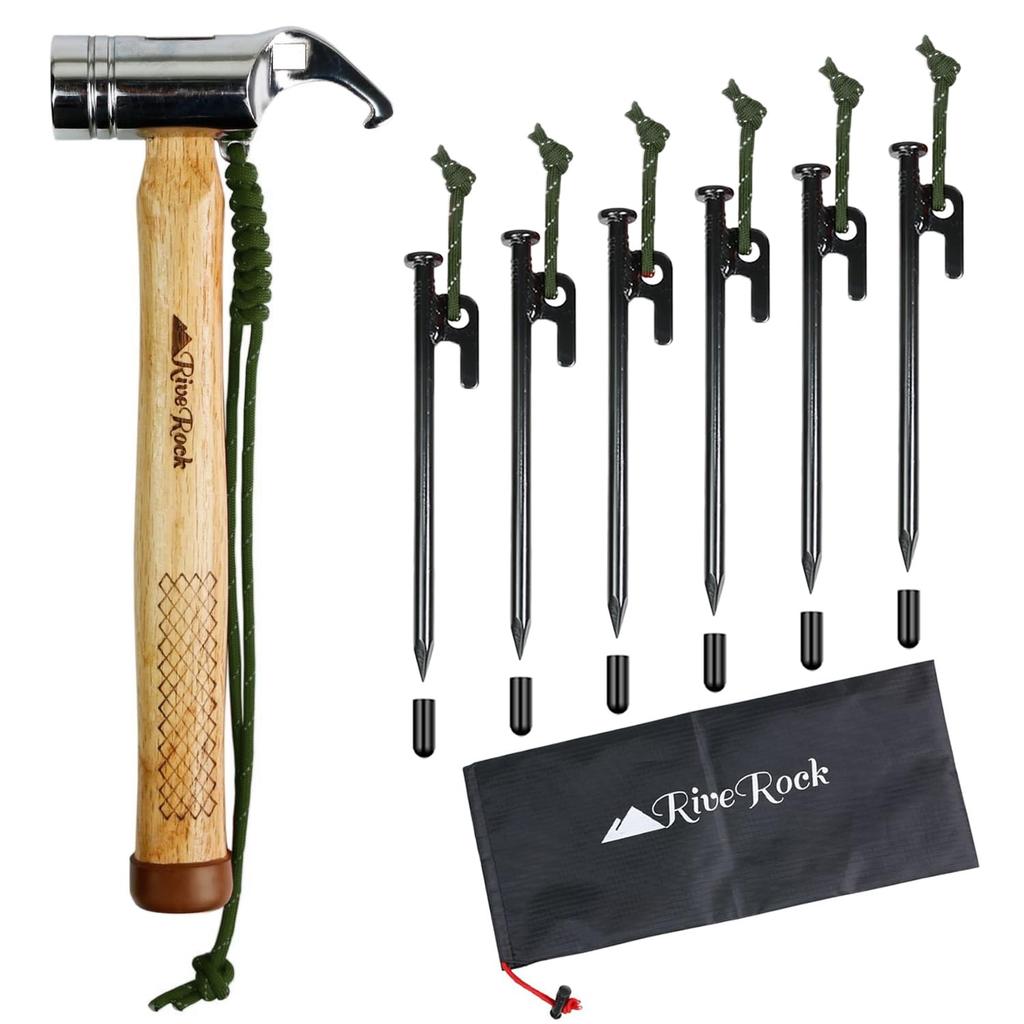 RiveRock Peg Hammer with Storage Safety 6 Luminous and Durable Design 6 Pegs Bag, Cap, Pegs, Rope, (Hammer + + Bag/Green)