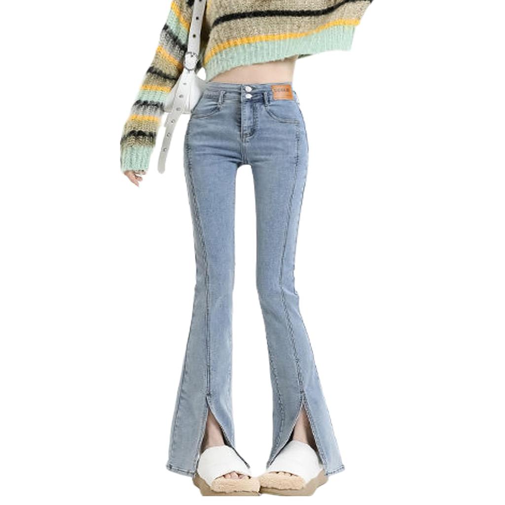 [Classic denim pants that can be worn all year round] These excellent denim pants can be worn all year round, and are a simple piece that adds a touch of style. The stretchy denim material makes them extremely comfortable to wear. The front zips up and has buttons, and the high waist and backline add a touch of cuteness with pockets. The flared design at the hem of the pants elevates the overall look, and the slit silhouette makes these flare pants look both casual and smart.
