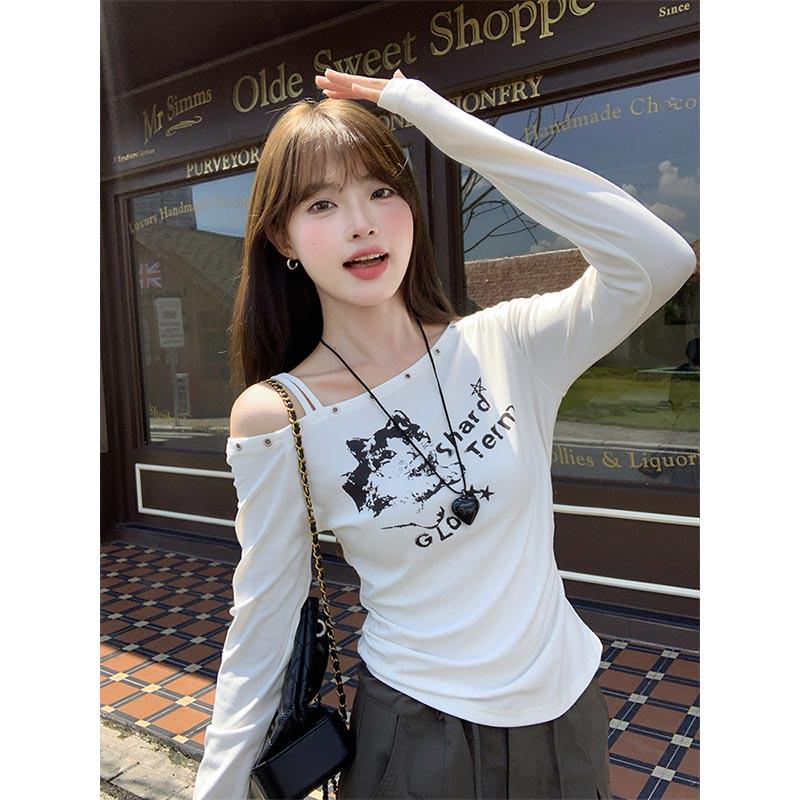 2025 Autumn/Winter Slim-Fit Cat Print One-Shoulder Long-Sleeve Top