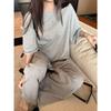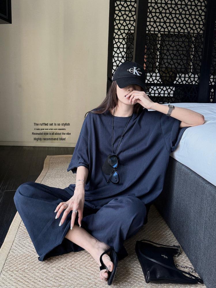 This stylish women's summer two-piece set features a pair of wide-leg pants and a matching top, both crafted from a comfortable cotton blend material. The top has a simple, solid pattern with a classic round neckline and short sleeves, offering a chic and breezy look perfect for warm weather. The wide-leg pants add a touch of elegance and freedom of movement, making this set an ideal choice for casual outings or laid-back occasions.