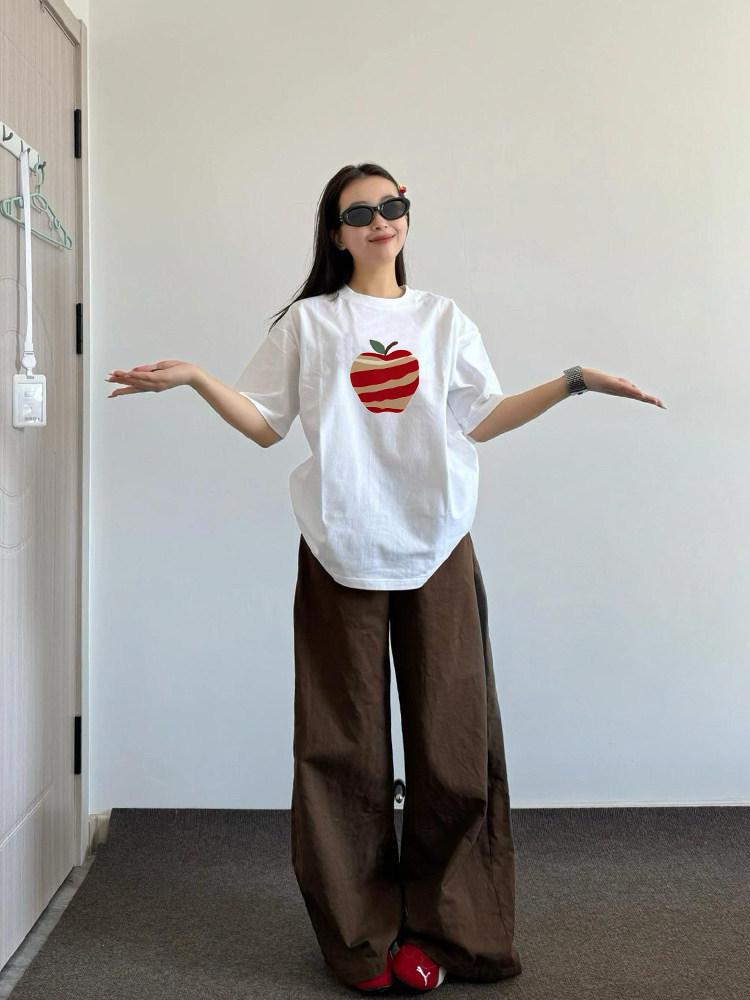 Embrace summer style with this women's loose-fit T-shirt, crafted from pure cotton for ultimate comfort and breathability. Featuring a playful apple print, this shirt offers a delightful touch of whimsy to any casual outfit. The short sleeves and round neckline ensure a relaxed, easy-going fit perfect for warm weather days. Whether you're heading to a picnic or enjoying a day out, this tee is a delightful addition to your summer wardrobe.