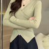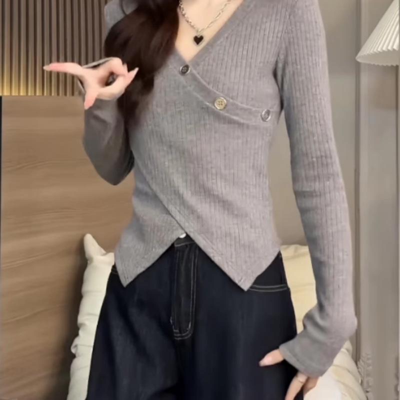 Korean Irregular V-Neck Long-Sleeve T-Shirt for Women, Autumn Petite, Sweet and Slimming Waist-Cinched Base Layer