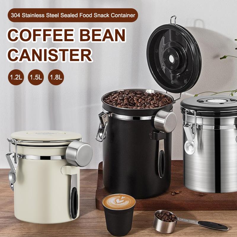 1.2 1.5 1.8L Coffee Bean Jar Airtight Canister Sealed Stainless Steel With Spoon One Way Valve Cannister Coffee Storage Kitchen