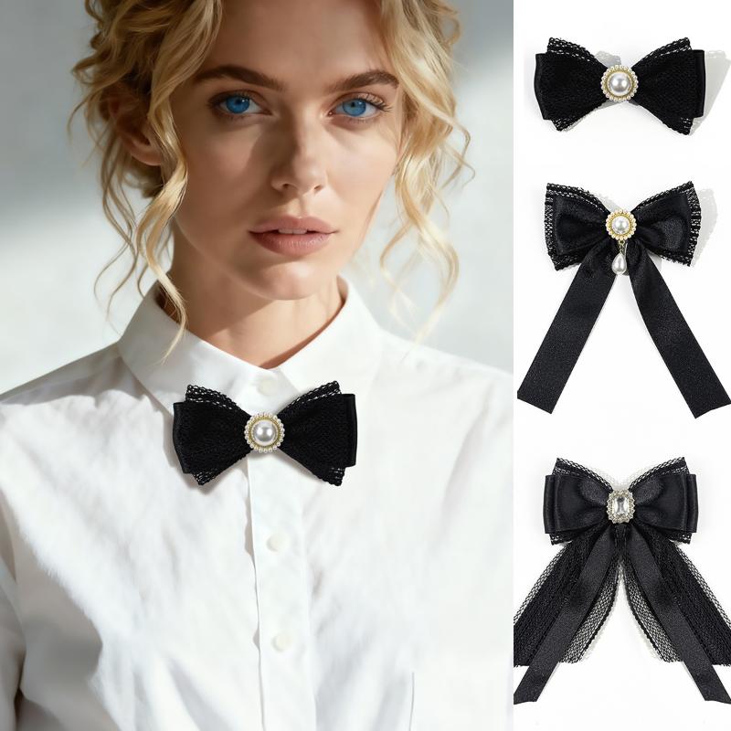 Black Lace Satin Ribbon Pearl Bow Brooch Tie College Style Ladies' Shirt Collar Pin Clothing Decoration Accessories