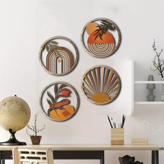 4 Pcs Wooden Round Boho Wall Art Bohemian Circle Wall Decor Hollow Out Farmhouse Hanging Sign for Bedroom Living Room Bathroom Patio Apartment