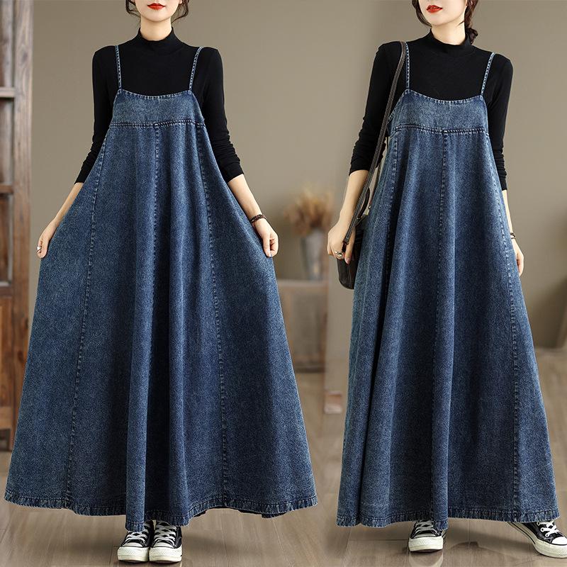 Women's French Retro Loose-Fit Denim Overalls Dress