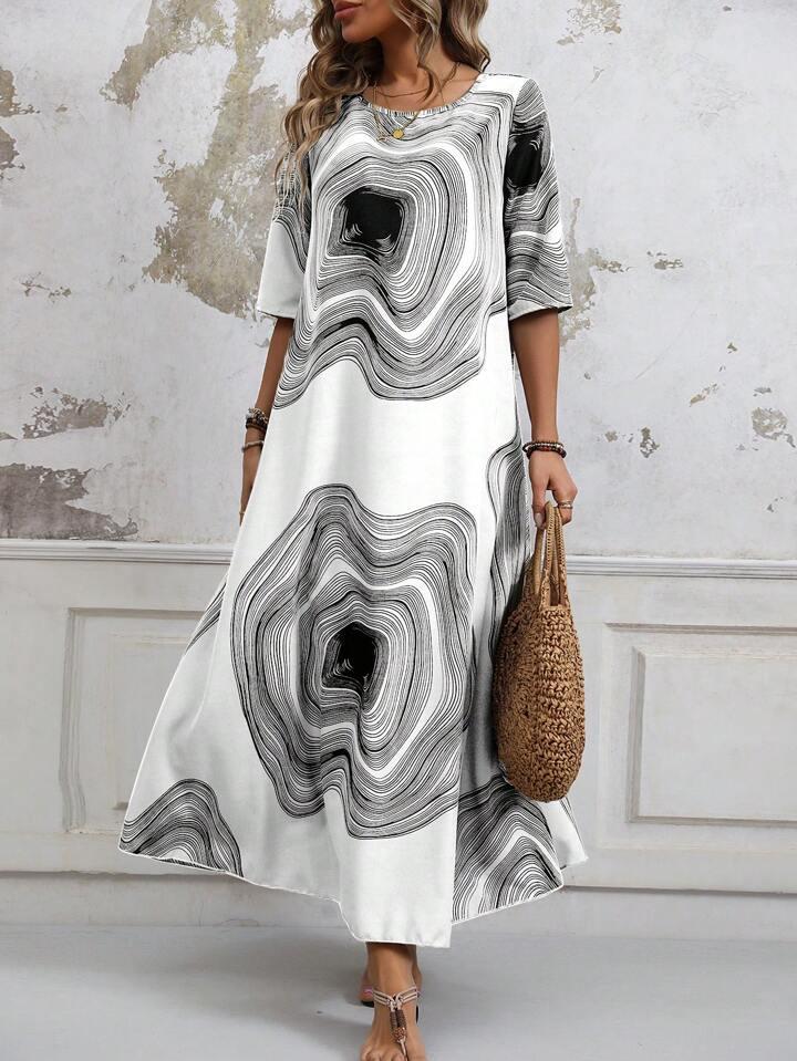 Introducing a stylish and comfortable summer beach dress designed for plus-size women, perfect for holiday outings. This dress features a beautiful printed decoration that adds a vibrant touch to your beachwear collection. Made from high-quality polyester, it offers a lightweight and breezy feel suitable for warm weather. The dress is crafted with a loose waistline for a relaxed fit, ensuring all-day comfort. It features a classic round neckline and 1/2-length sleeves, making it an ideal choice for both casual and semi-formal occasions. Embrace the holiday spirit with this versatile mid-length dress that effortlessly combines fashion and ease.