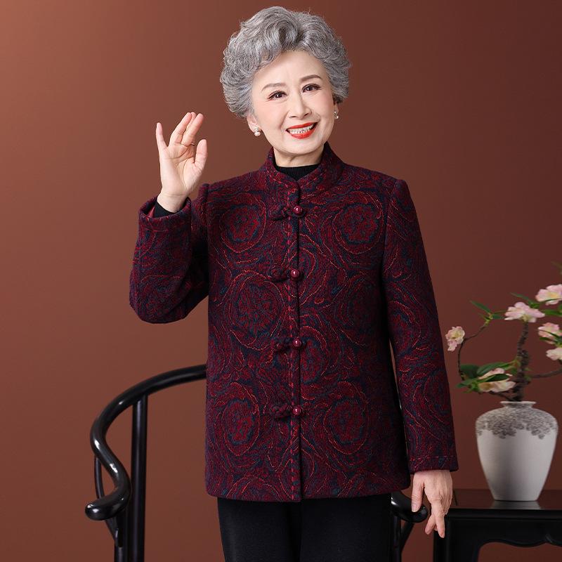 This luxurious coat is designed for elderly women who appreciate both warmth and elegance during the winter months. Crafted from high-quality polyester, it features a velvet wool texture that adds a touch of sophistication. The coat is thickened for extra warmth and comfort, making it ideal for chilly weather. Its design is inspired by traditional Tang suits, combining cultural flair with modern practicality. With a focus on comfort, style, and durability, this coat is perfect for keeping warm while looking chic.