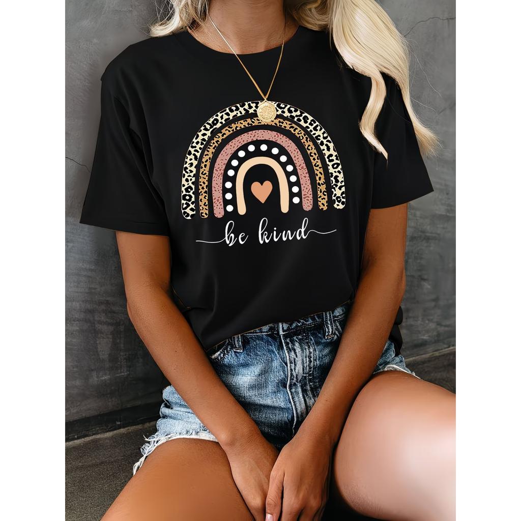 Be Kind Letter Leopard Print Short-Sleeve Round Neck T-Shirt