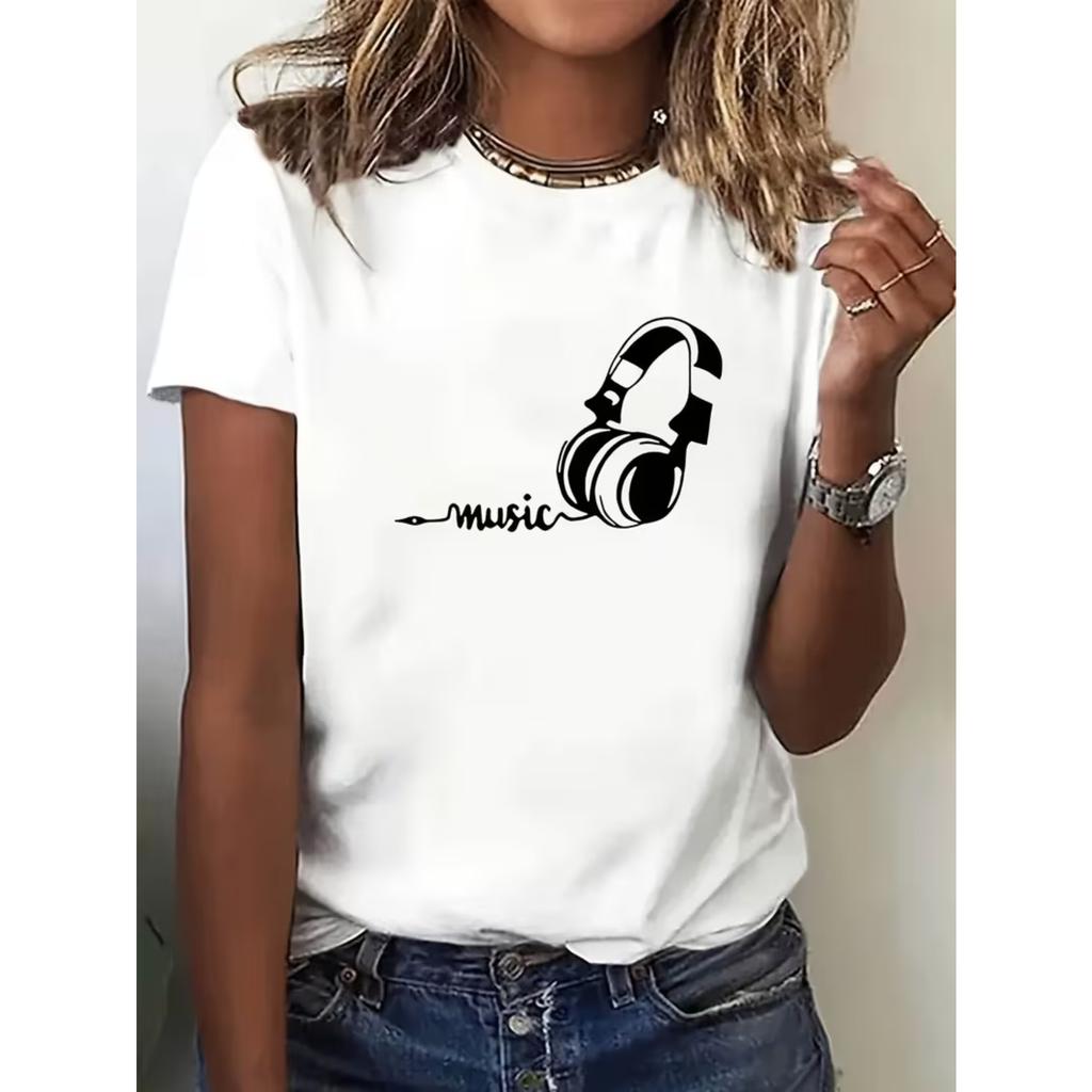 Women'S Casual Music Headphones Graphic T-Shirt - White Short Sleeve Crew Neck, Loose Fit, Music T Shirts