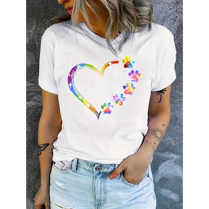 European Size Fashionable Heart-shaped Dog Paw Print Women'S T-shirt, Comfortable And Relaxed, Round Neck, Suitable For All Seasons