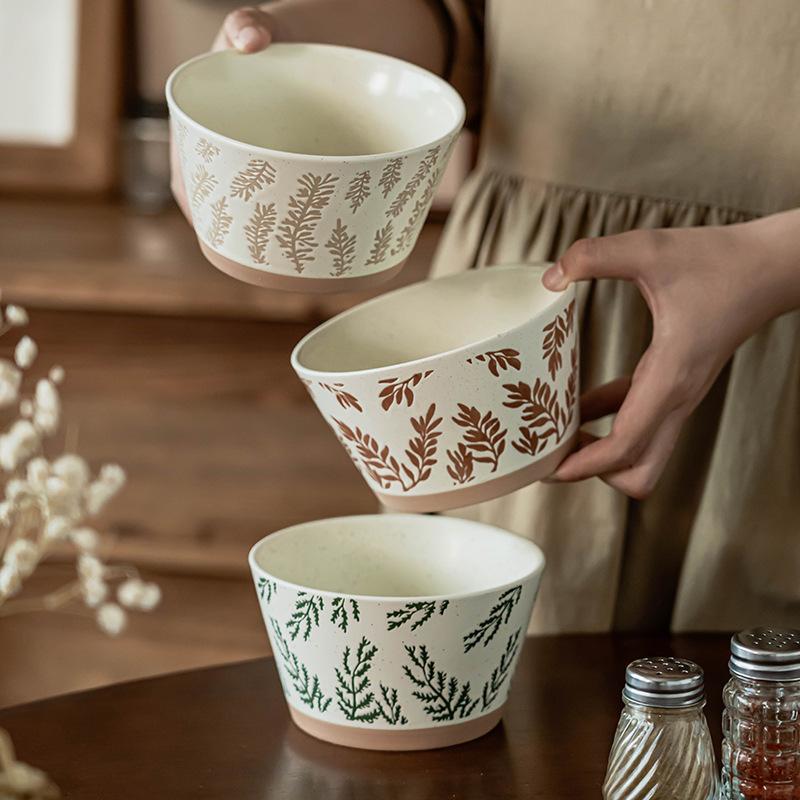 Salad Bowl Pastoral Hand-Painted Ceramic Bowl Japanese-Style Relief Rough Pottery Bowl Household Tableware Rice Bowl Vegetable Bowl Fruit Bowl