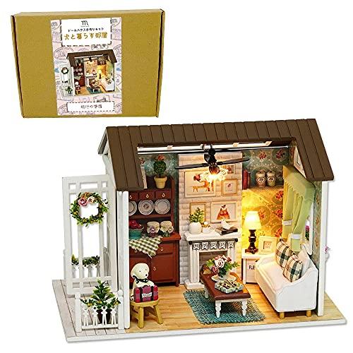 Moin Moin [Japanese Instructions] 1/24 Scale Dollhouse Miniature DIY Kit Set for Beginners | Dog-Friendly Room | LED Light + Acrylic Case (Travel Prep