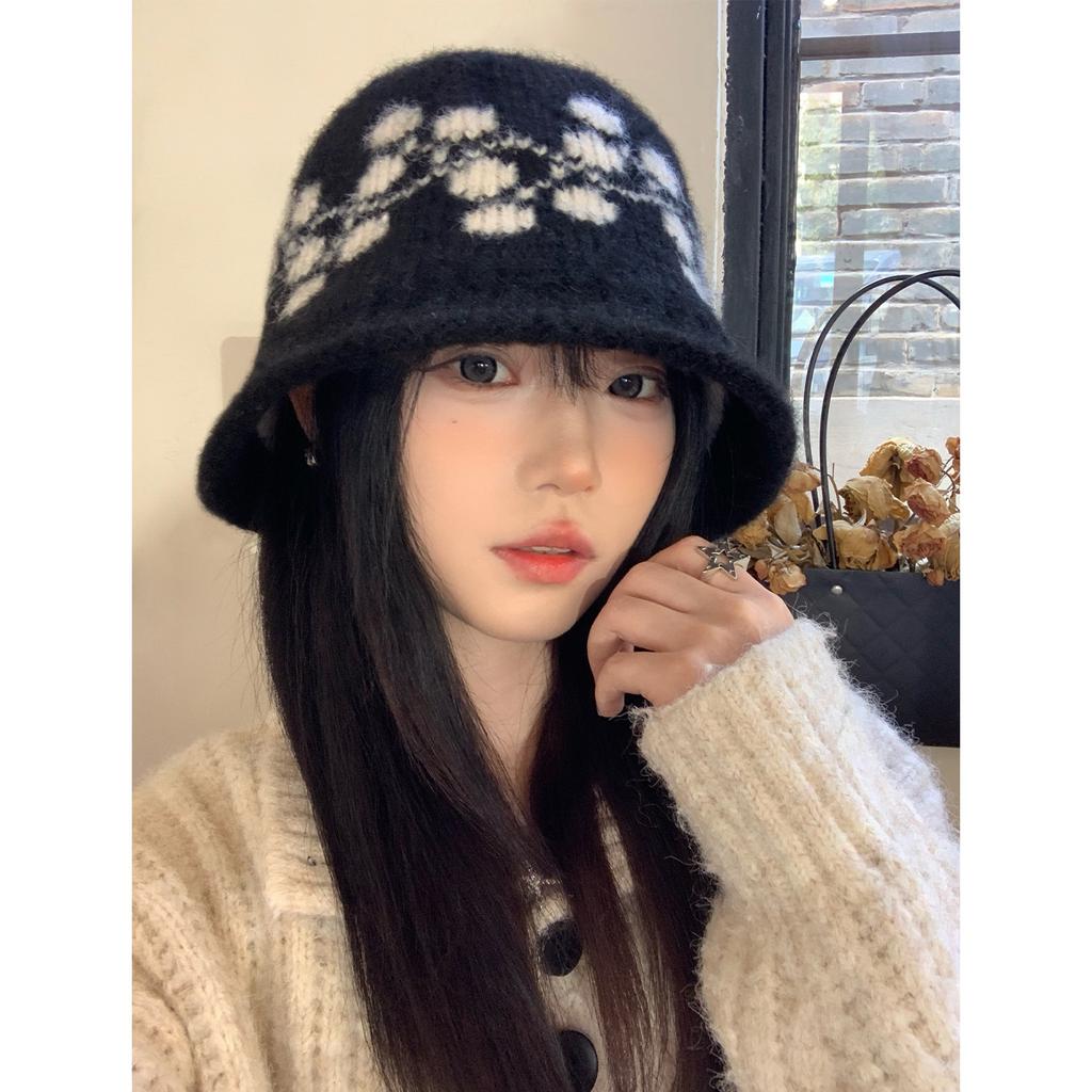 Retro Style Jacquard Knitted Bucket Hat Women's 2025 New Plush Hat, Ear Protection and Face Small Pullover Hat