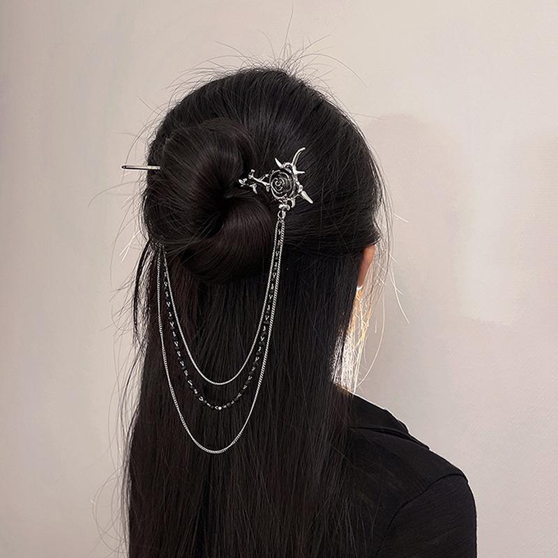 Personalized And Fashionable Gothic Punk Thorn Rose Tassel Beaded Chain Hair Stick For Women Daily Hair Accessories