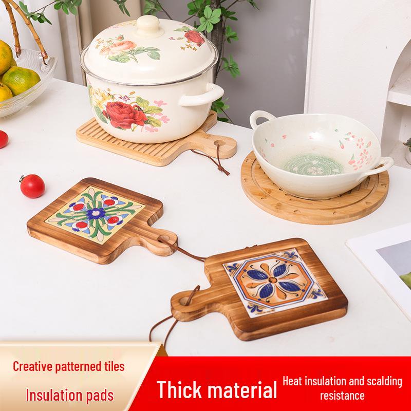 Retro Insulated Wooden Placemat for Pots and Plates, Flower Tile Design