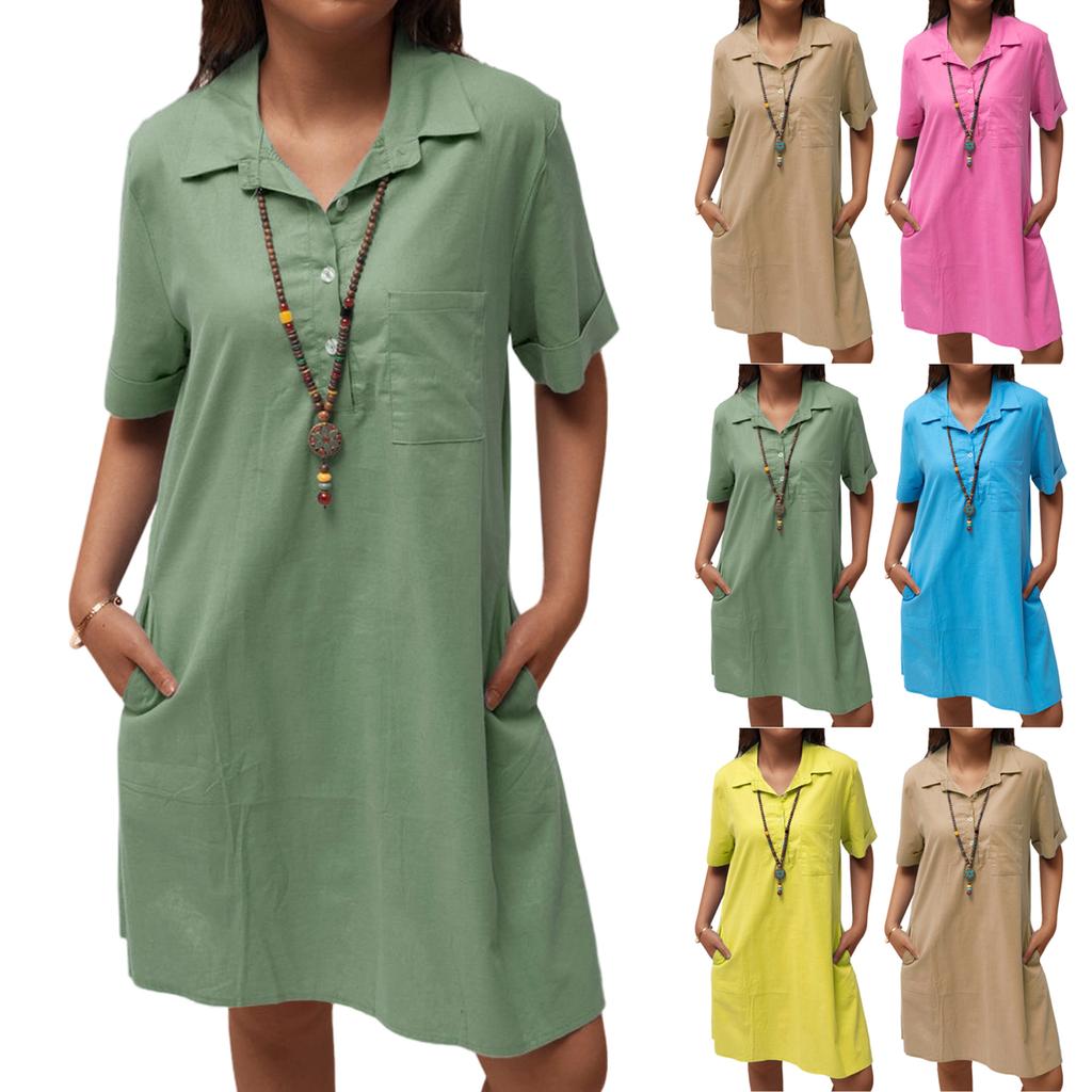 Women's Shirt Dress Button Down Short Sleeve Dresse With Pockets