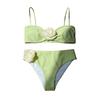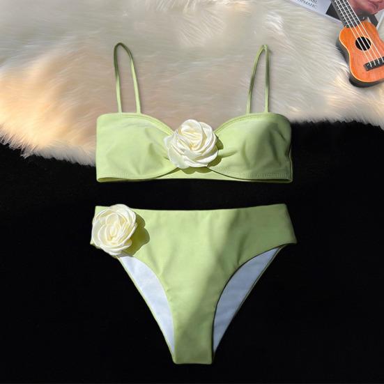 The bodice is adorned with three-dimensional faux blooms, each petal meticulously heat-pressed by hand to achieve the naturally curled form of a rosebud. The flowers are artfully scattered across the fabric, swaying gently with every movement as if a garden were blooming upon the skin. From sunlight to sea spray, the petals retain their crisp, three-dimensional shape without wilting, ensuring every dip into the water becomes a visual focal point.