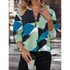 Color Block Printed V Neck T Shirts for Women Loose Casual Tops Long Sleeved High Street Autumn Geometry Zipper Clothes