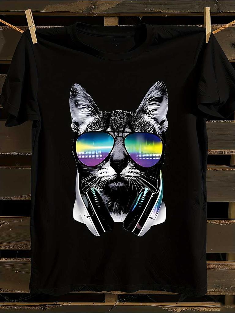 DJ Cat & Music Note T-Shirt Mens Tshirt Womens Tshirts with Letters Print Short Sleeves T-Shirt Casual Street Tee Shirt Top