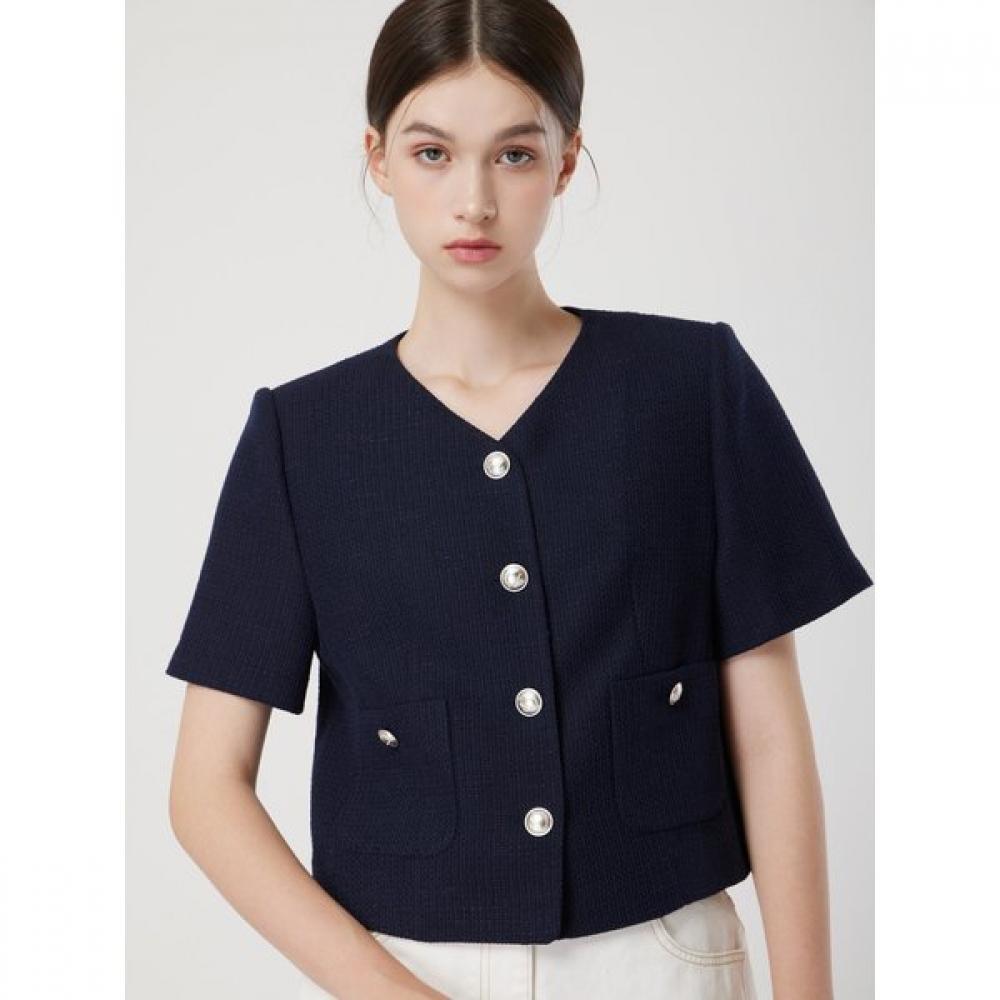The [CC Collect][C-Exclusive] Half Sleeve Crop Tweed Jacket features a relaxed silhouette with a V-neck collarless design, highlighted by exterior pockets and metal buttons. Crafted from lightweight and airy summer tweed fabric, it can be worn comfortably in the summer heat. Additionally, the chiffon lining reduces friction and reinforcing interlining is attached throughout to prevent fabric fraying. It is an item that can be casually yet femininely coordinated.