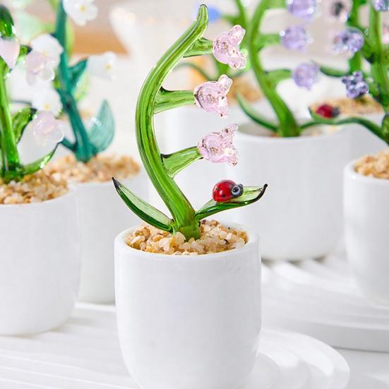 Hand Blown Mini Glass Flower Figurine Faux Crystal Small Lily of The Valley Flower with Pot for Wedding Mother's Day Office Home Table Centerpiece