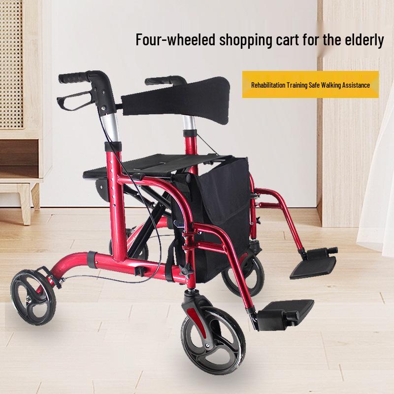 Lightweight Foldable Four-Wheel Walker with Seat and Shopping Trolley for Seniors