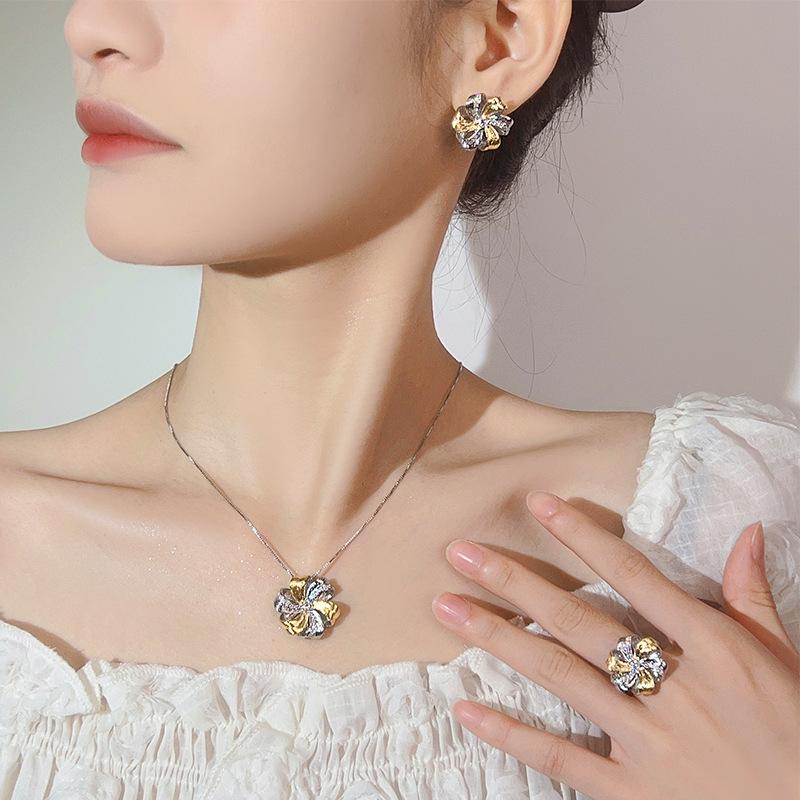 New Set Of Jewelry Necklace Earring Ring Retro French Brushed Inlaid Versatile Fashionable Women's