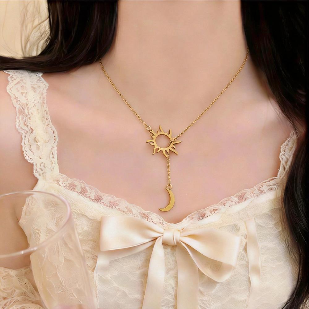 Stainless Steel Adjustable Double Layer Sun & Moon Pendant Necklace - Light Luxury Style