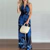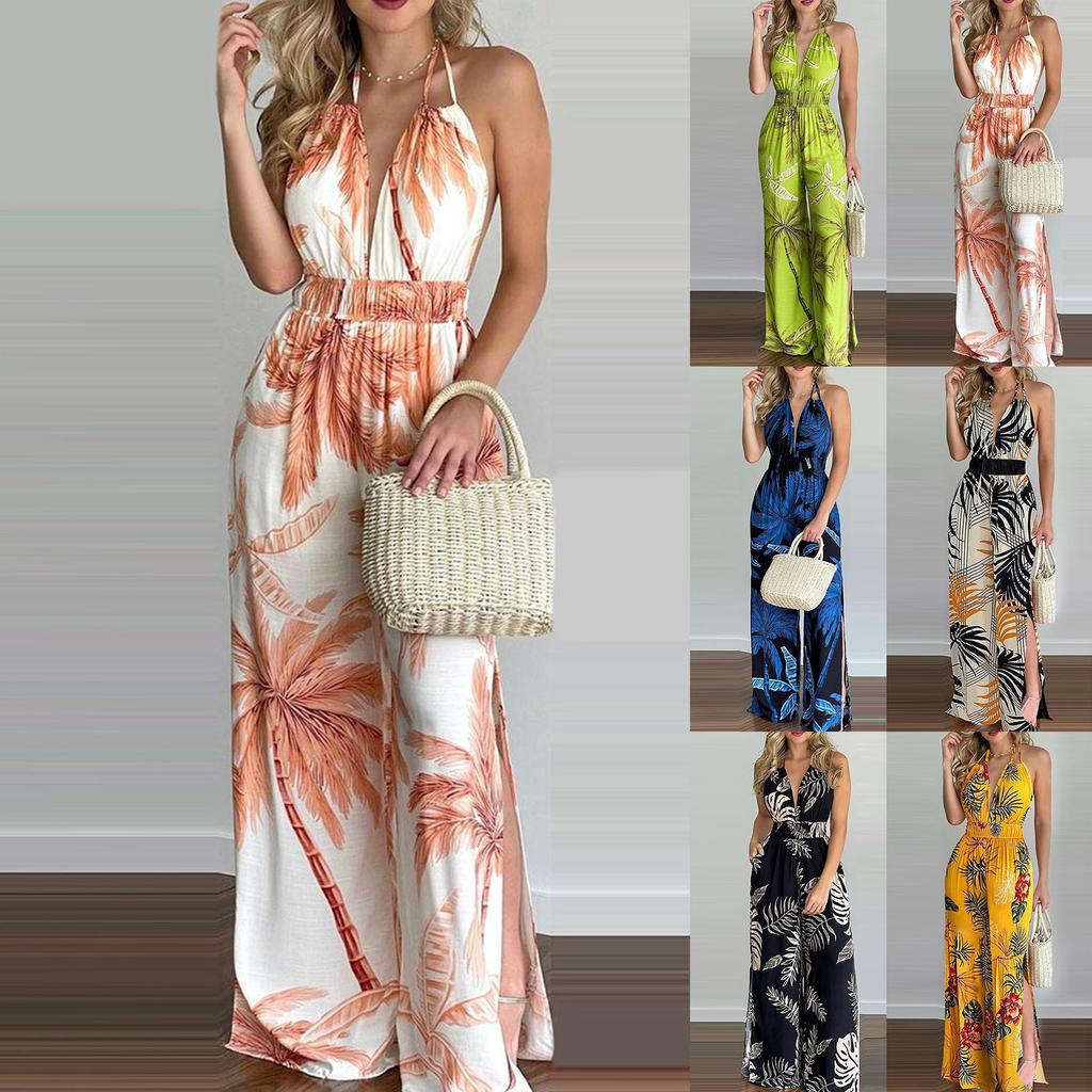 Fashion Tropical Print Halter Jumpsuit Women Backless Elastic Waist Wide Leg Beach Romper