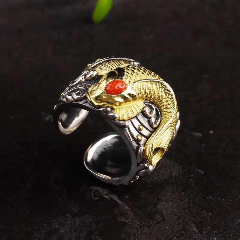 Men's Koi Adjustable S925 Silver Thumb Ring - Handmade Retro Ethnic Style Jewelry