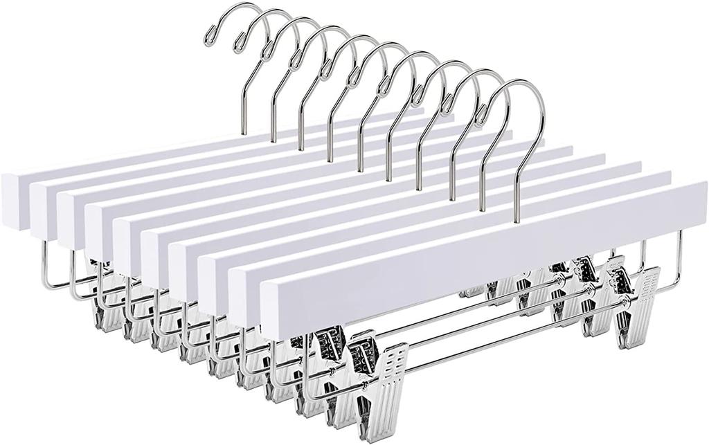 Amber Home Wooden Trouser and Skirt Set of Pants Bottoms Slacks Prevents Shape Strong Wrinkle Rotating Closet Storage Space White Hangers, 10,