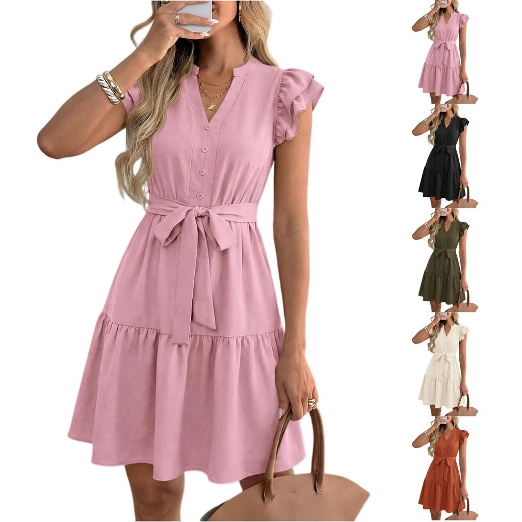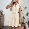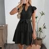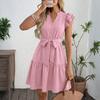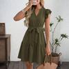 Women's Fashion V-neck Short Sleeve A- Line Skirt Lace-up Waisted Dress