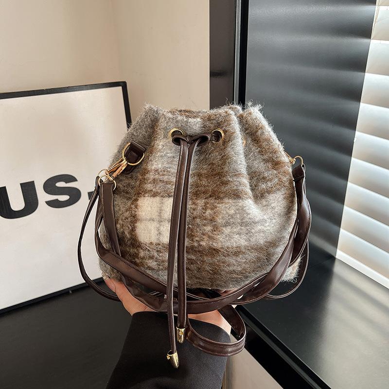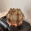 Vintage Plaid Women Woolen Shoulder Bucket Bags Korean Style Ladies Drawstring Handbags Autumn Versatile Female Crossbody Bag