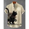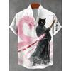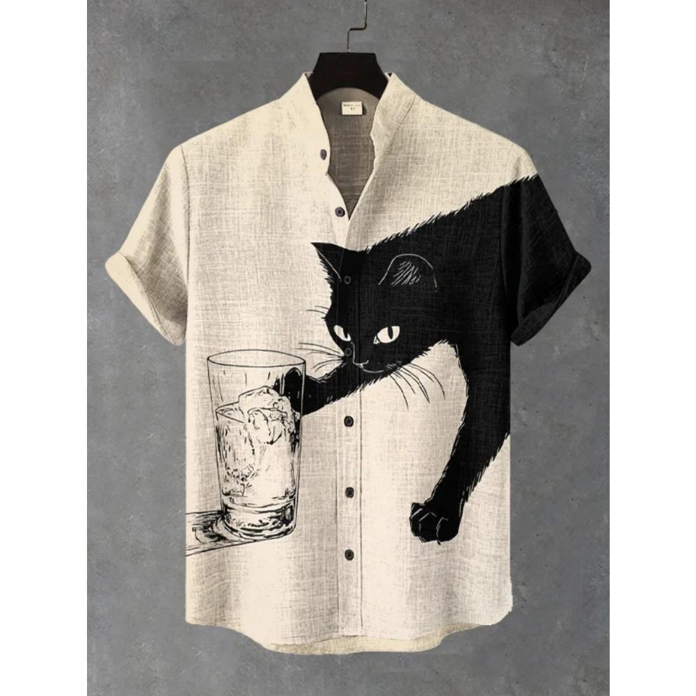 Men's Japanese Retro Art Black Cat Print Shirt Short Sleeve Stand Up Collar Single Breasted Casual Linen Top for Vacation