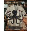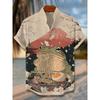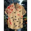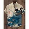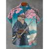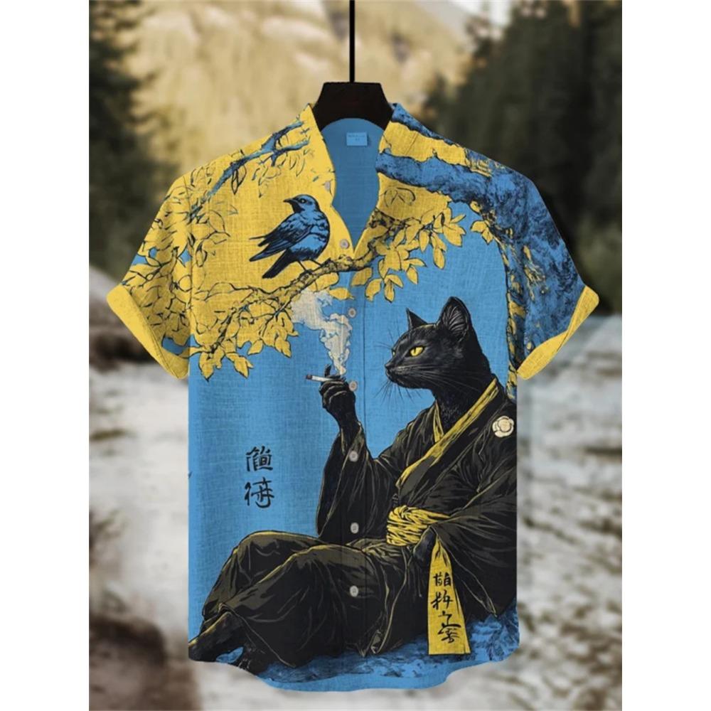Men's Japanese Style Kimono Cat Printed Linen Shirt Summer Fashionable Stand Up Collar Short Sleeve