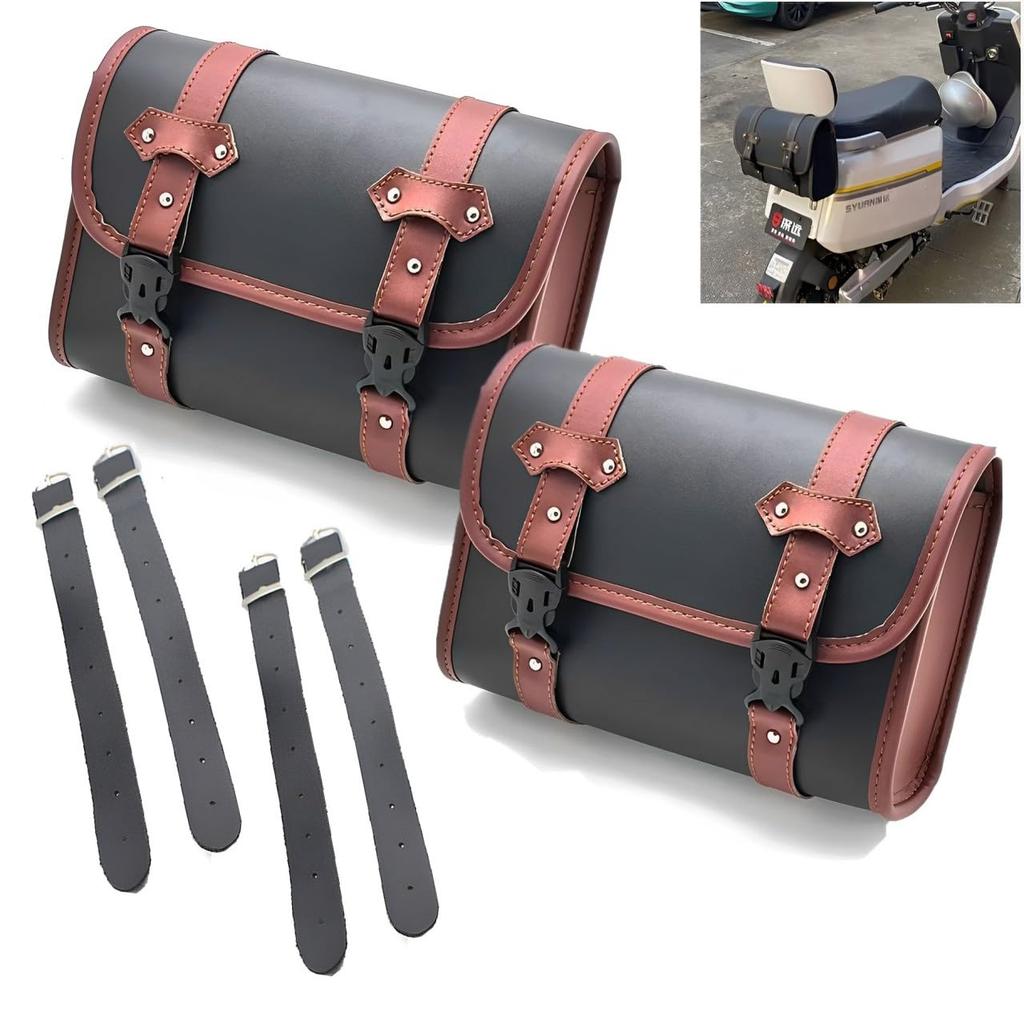 This set of two motorcycle side bags features a simple, antique-inspired design that complements a variety of models, including naked bikes with limited storage space, American and European bikes, Leon Art Pilder, Harley, Rebel, Vmax, and Cub. Made of waterproof PU leather, they're safe to use even in the rain. (Please note that in heavy rain, water may seep in through the gaps in the top lid.) The included straps allow for easy installation on front forks, backrests, sissy bars, carriers, and frames. [Size] 28cm W x 10.5cm D x 21cm H [Material] PU body, metal, plastic buckle [Capacity] 15L [Weight] Approximately 500g