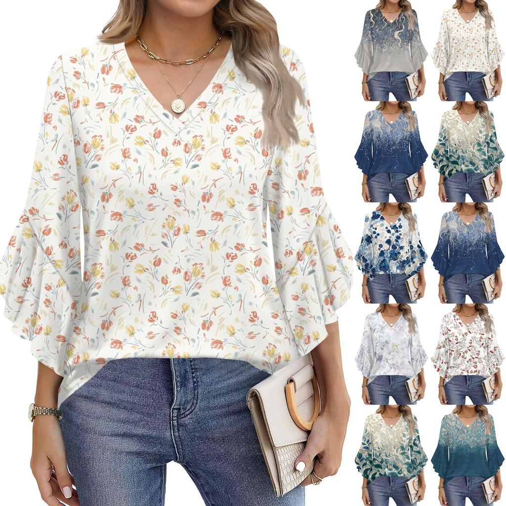 Blouses For Women Dressy Casual 3/4 Length Sleeve Womens Tops V Neck Tshirts Shirts With Flared Sleeve