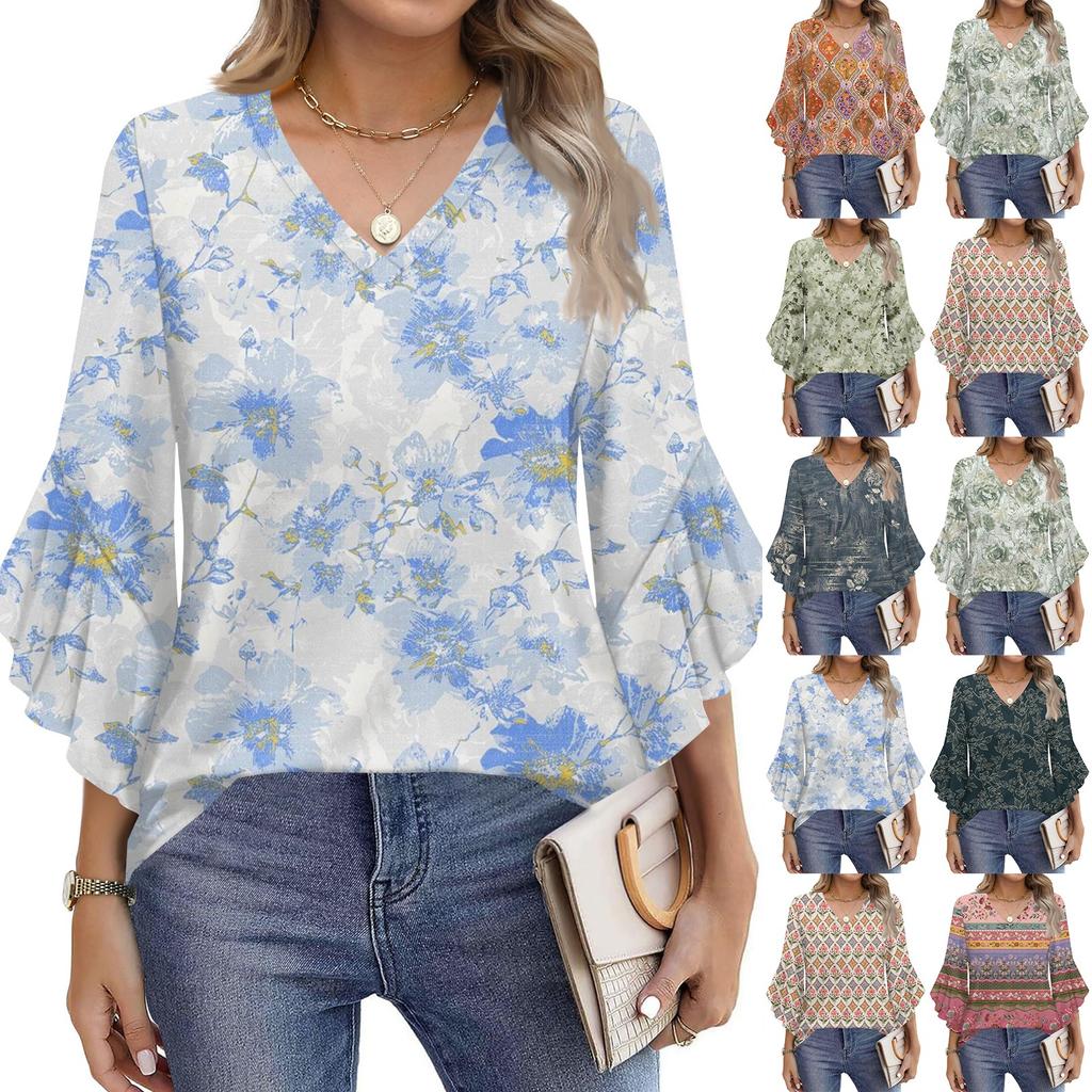 Blouses For Women Dressy Casual 3/4 Length Sleeve Womens Tops V Neck Tshirts Shirts With Flared Sleeve
