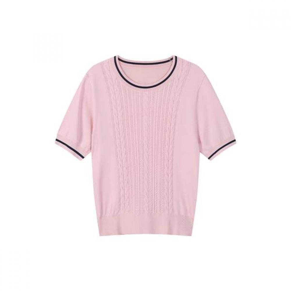 The Line Color Block Short Sleeve Knit AS1KH266 features a stylish round neck design with attractive color block details. Made from soft and stretchy fabric, it is suitable for everyday wear. This versatile item offers comfort and can be paired with various bottoms.