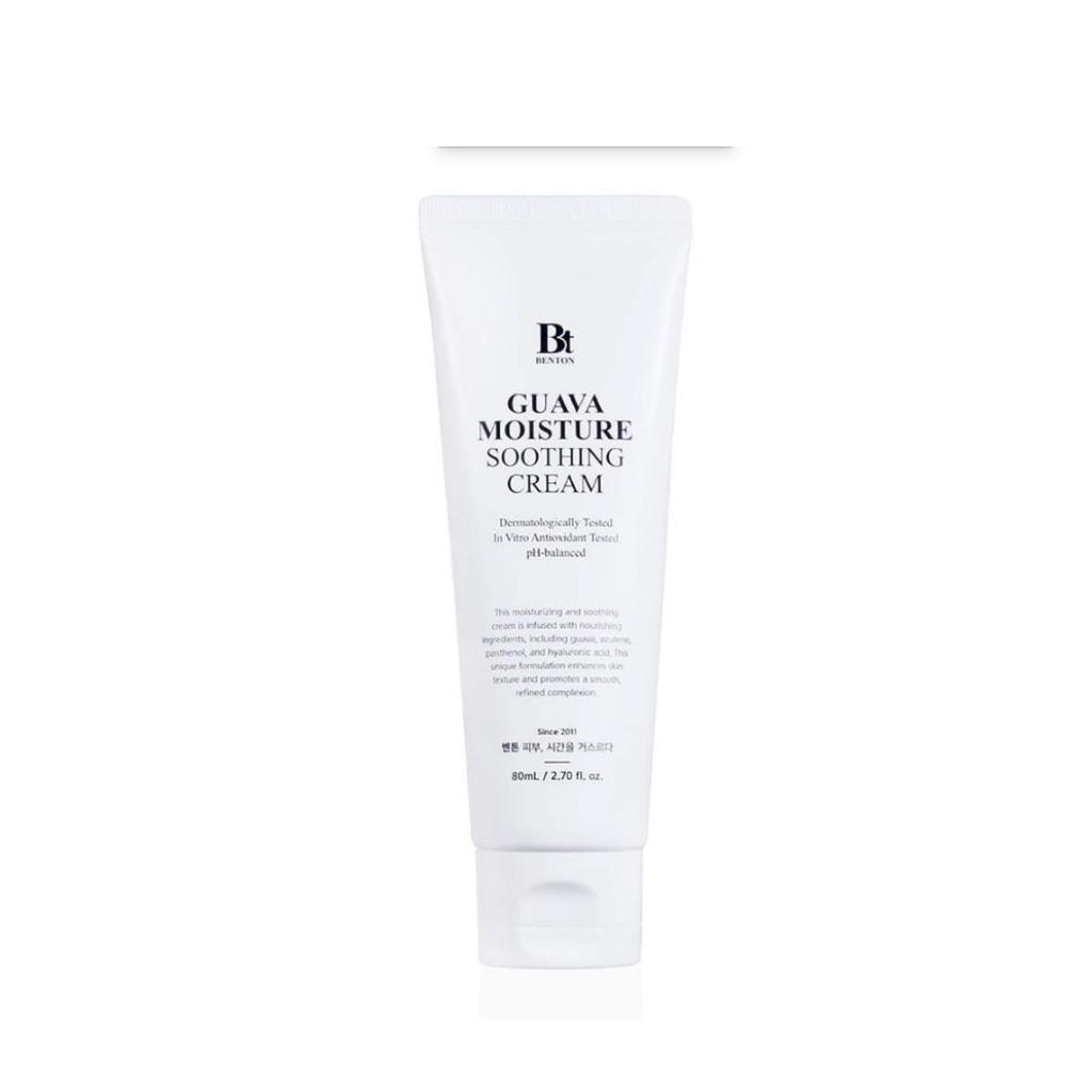 Benton Guava Moisture Soothing Cream is a gentle moisturizing cream designed to hydrate and calm sensitive skin. Enriched with guava leaf water, guava fruit extract, and panthenol, it helps soothe irritation while maintaining long-lasting moisture. The soft cream texture spreads smoothly and absorbs quickly without heaviness. Ideal for daily use, it leaves skin comfortable, balanced, and refreshed.