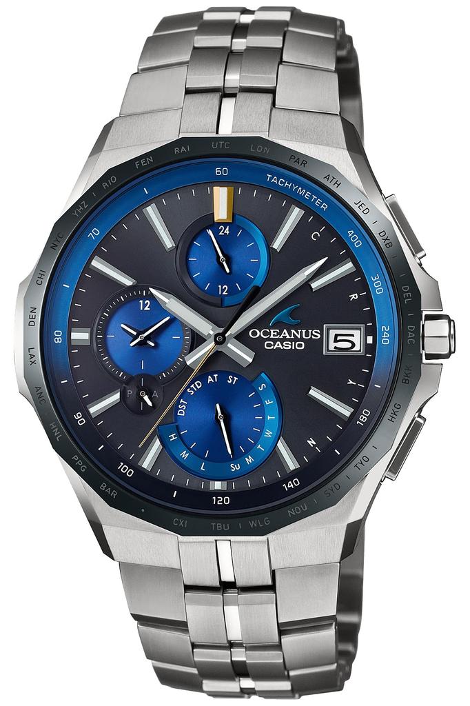 The Ocianas Manta, which pursues high-quality finishing and a thin, beautiful form under the brand concept of "Elegance, Technology," has introduced an elegant model that is the thinnest* in the Manta's history, thanks to the newly developed module. The new module is the thinnest in Manta's history* and the thinnest in the history of Manta, thanks to a single-sided high-density mounting of components on only one side of the board, whereas conventional modules were placed on both sides. The thin and beautiful silhouette unique to Manta has been expressed. In addition to time correction by the watch itself using the standard radio wave reception function, the watch is equipped with a time correction function by smartphone link using BluetoothⓇ. The smartphone link function allows the user to easily and intuitively set the world time from approximately 300 cities and automatically change the time zone and daylight saving time. In terms of design, the watch is linked to a smartphone to manage city information on the smartphone side, and the city code is indicated on the bezel, ensuring high legibility with a clean face design. The curved line that flows from the case to the band creates an even more elegant silhouette. The Manta's unique hexahedron-cut polygonal bezel is employed in two models: a simple silver-colored bezel with a more prominent blue color, and a high-quality, intrepid black bezel with a DLC coating that excels in wear resistance. The dual-curved sapphire glass windshield with a beautiful side view and the case and band, which boast high abrasion resistance due to the rough polishing and titanium carbide treatment that requires expert skills, are all details of high quality finishing. OCEANUS Manta is a fusion of advanced functions and thin, elegant design.