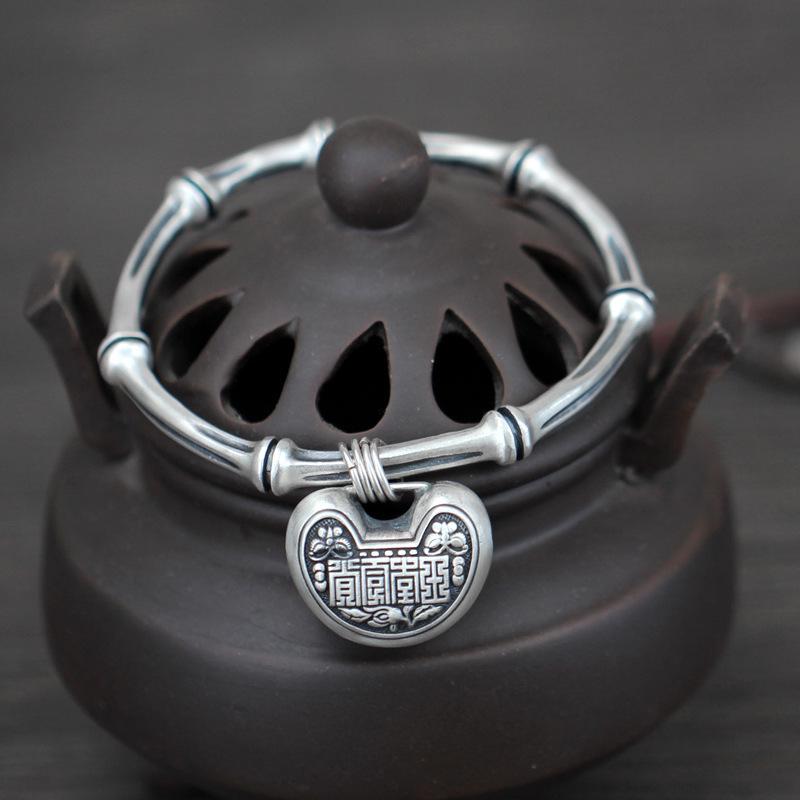 99% Pure Silver Ruyi Lock Bamboo Joint Bracelet for Women, Ethnic Retro, Open Bangle