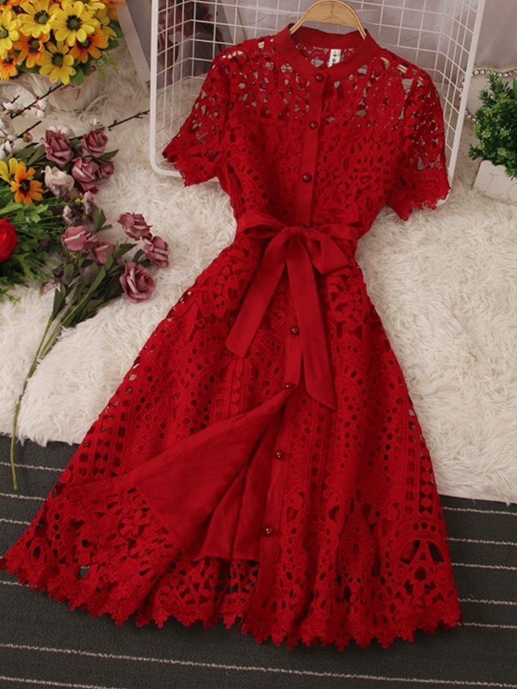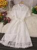 New Tide Summer French Stylish Hollow Out Lace Dress Women Elegant Solid Open Stitch Lace Up Evening Dress