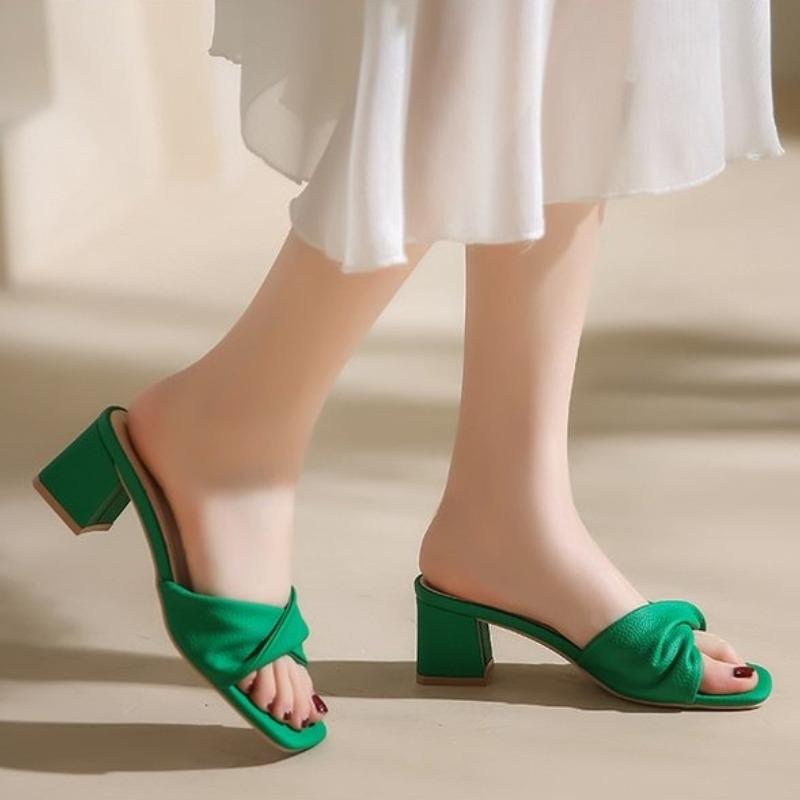 New Summer Green Orange Women Slippers Solid Color Shoes Classic Square Toe Flip Flops Beach Med Heel Slides Mules
