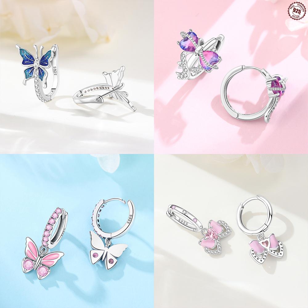 925 Silver Purple Heart Butterfly Earrings Pink Bows Blue Zircon Earring Women's Accessory Earrings Fine Valentine Gift Jewelry